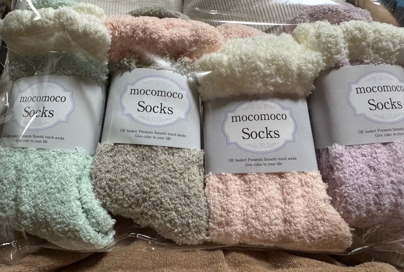 このもこもこルームソックスを見つけたときも、ふんわりしたパステルカラーにひとめぼれしました。