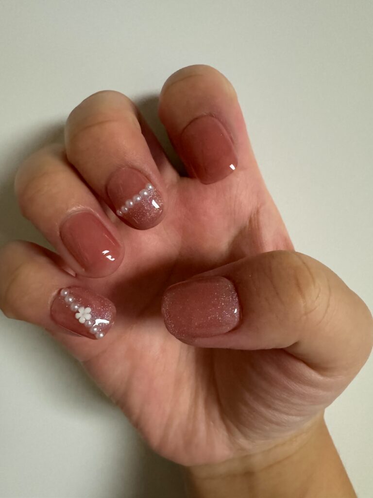クリア感のあるピンクのラメとお花のストーンのネイルチップにしました。