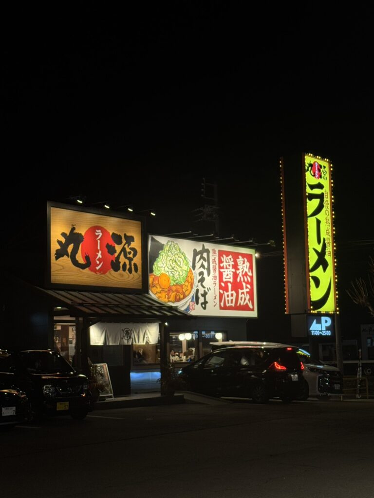 夜、丸源ラーメンの看板を見つけ、結構目を引き「写真におさめたい」と思い、スマホを向けて暗さを調節して撮影。